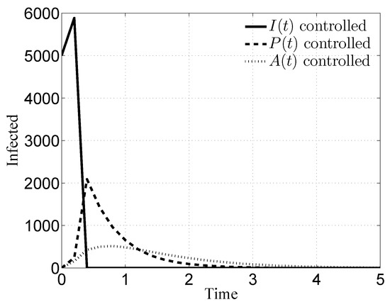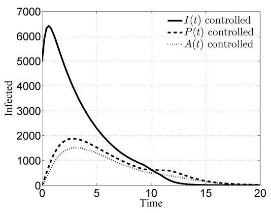 The effects on the state behaviour were a confirmed fast change of (Figure 27) and (Figure 28) in the first part of the time interval, due to the initial high peak of which mainly affects these two state variables, as long as a stronger effect of on the infected individuals I, P and A, Figure 29 for the transient part of the evolution, which is evidenced by a faster decrement of their quantities and by lower steady state values.