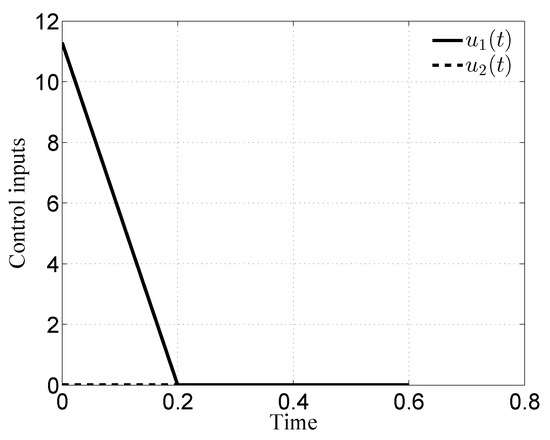 The solution comes directly from the application of the minimum Pontryagin principle. Let satisfy the system (1)–(5) and the initial state conditions (11). The necessary conditions for to be a minimum for the cost index (12) are the following: defined H as in (16), there exists a function , (first derivatives continuous almost everywhere) not simultaneously null, such that (23) holds and