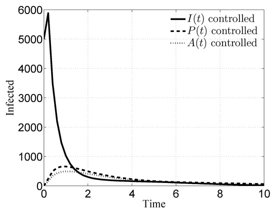 The control is neglected once again. The numerical choice for is here performed letting each control use a total amount of resources equivalent to the maximum value they were able to use in the previous cases, computed as the upper bounds of case times the time interval of control action, yielding to .