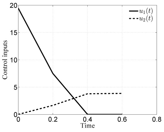 After this characteristic behaviour in the initial time, a constant action of both the control, Figure 18, with a little bit higher than , also due to the fact that the first control has already used some of the resources at , so having a lowed amount with respect to the second control.