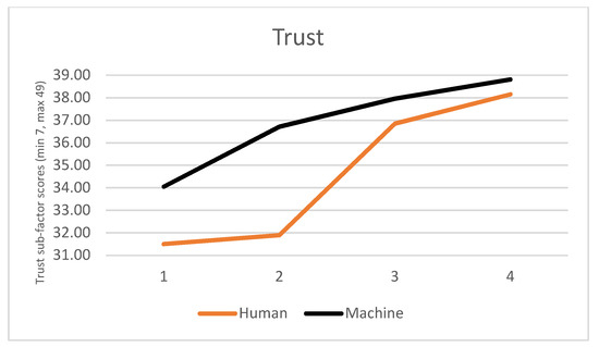 We conducted a 4×2 repeated-measures ANOVA on the responses from the Scale of Trust in Automated Systems [75], using the trust scores for each of the four trips as dependent scores, and the two driving styles as a between-groups factor. We ran the Kolmogorov-Smirnov test for normality on these trust variables, and there were no significant differences, thus the data is normally distributed. There were no group differences between the human-like or machine-like driving styles (F(1,39) = 1.711, p = 0.20) with low observed power and effect size (0.248 and 0.042 respectively). There was a main effect of trust scores across trips F(3,117) = 25.403, p < 0.0001, partial-eta² = 0.394, where trust increased across the four journeys irrespective of driving style (Figure 4), with the standard deviations shown in Table 1. As there were no group differences, we used paired t-tests to identify the post-hoc differences in trust scores across the four trips. There was a non-significant difference between comparisons of the 1st and 2nd trust scores only (t(40) = -1.980, p < 0.055) (Table 2), with all other paired comparisons showing significant differences.