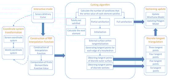 In our method, to reduce the waiting time of the system, a surface-based rendering method is adopted to meet the general requirement of rendering only the outer surface of the entity. In addition, to display the internal data of finite elements, this study implements an arbitrary cutting method for finite element data. With the rapid development of rendering technology and hardware equipment, as described by Qi et al. [], interactive experience has become the main bottleneck for large-scale three-dimensional visualization tools. Zhang et al. proposed an improved parametric line clipping and polygon clipping algorithm to complete the cutting [], while we used surface clipping. Takayama et al. cuts the model by drawing a freeform stroke []; they mainly focused on the generation of texture. Inspired by their interaction mode, we intend to use the interactive method of drawing free curves to complete data cutting. To improve the user experience of the software and simplify the interactive process, this study applies RBF interpolation to finite element data cutting and proposes a visualization method for arbitrary curve section. In contrast to traditional methods, our method supports not only plane cutting, but also arbitrary surface cutting; in our method, the user can achieve an arbitrary screen curve via drawing. After that, the smooth function is constructed using the RBF interpolation method, followed by the calculation of the value of finite element data in the function. Then, coordinate transformation will be executed, due to different coordinate systems. After performing the cutting algorithm, discrete cutting points are calculated. Finally, the cutting points are triangulated to draw the entities after cutting. Figure 1 shows the entire process of our method.
