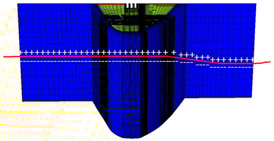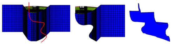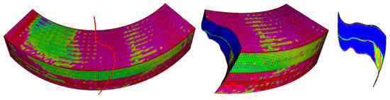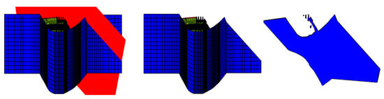 In the three-dimensional visualization technology, user interaction experience has become a very important indicator. Traditional cutting mostly realizes plane cutting. In this study, the method of drawing an arbitrary curve on a screen is proposed to complete surface cutting. This interactive mode brings better user experience. In order to verify the validity of this method, we have done plane cutting and surface cutting for dam II and the lead block models. In order to better show the effect model, we use solid and wireframe to render in the online frame mode. The visualization effect after cutting is real and comprehensive. It can not only make the shape of the cut entity clear at a glance, but also clearly see the topological relationship between all the tangent points of the section. Figure 7 and Figure 8 represent the result after the plane cutting of dam II and the lead block, respectively, while Figure 9 and Figure 10 represent the result after curve cutting of dam II and the lead block, respectively. In these figures, the original model before cutting is on the left, the solid effect picture after cutting is in the middle, and the section after cutting is on the right. As seen from the figures below, the plane equation used in plane cutting is displayed in the shown form of a red plane, which can draw the entity and the plane after cutting. The red free curve in the surface cutting represents the trajectory of the mouse, which can clearly draw the solid and cutting surface after cutting. As shown in Figure 9 and Figure 10, the surface is very smooth after cutting. The values after cutting are calculated via interpolation and displayed in different colors; the points with large values are in red, while those with small values are in blue. In addition, the external surface of the cut entity is marked with black lines to identify the topological relationship of the finite element data, and the section profile is clearly divided in the form of a black outer frame, which is convenient for the user to conduct relevant operations on the cut entity and complete their experimental analysis with more intuitive profiles.