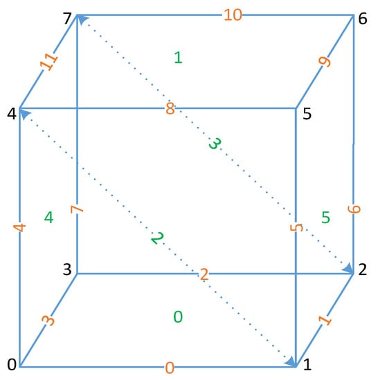 For the newly generated pointcut, part of the pointcut information is encapsulated to facilitate subsequent work, such as triangulation. In this study, the data structure of the pointcut is defined according to the algorithm requirements: a tangent point first needs to record its own ID and coordinate values in the x-, y-, and z-directions; then, the surface, edge, and point of the grid element to which the point belongs must be recorded to distinguish the point of tangency and the original vertices; the number of the tangent point is marked −1. The data structure of the tangent point is shown in Figure 4, where the number in green represents the surface number, the number in orange represents the edge number, and the number in black represents the point number. For example, a hexahedron has six faces, where 0–5 correspondingly represent the bottom, top, front, back, left, and right sides. Edges and points are also marked with these numbers.