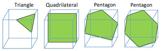 To generate the section, these discrete points must be triangulated. Surface cutting of the solid model can be regarded as cutting every small mesh plane and then constructing the surface from all microplanes. The number of tangent points generated by a plane to a hexahedron can only be three, four, five or six. That is, only triangles, quadrangles, pentagons and hexagons can be generated after cutting. As shown in Figure 5, it is easy to understand the case where the triangle and the quadrilateral are obtained after cutting, and the condition for obtaining the pentagon after cutting is that the tangent point must satisfy the following conditions: (1) a point on an edge; (2) points of two edges that are parallel to the edge; (3) the midpoints of two edges that on the vertical plane of the very edge and that do not intersect the very edge. The plane formed by the five points is used to cut the hexahedron to obtain a pentagon. The condition for obtaining a hexagon after cutting is that the tangent point must satisfy the following conditions: (1) first take a vertex; this vertex leads to three edges, taking the midpoints of the two edges that are not perpendicular to the bottom and top surfaces; (2) take the midpoint of the two edges that intersect the two edges of (1); (3) middle points of two edges which are parallel ones on the parallel faces of the two edges of (1) and any two of parallel ones are not intersected by another edge. On traversing these six points, a hexagon is obtained.