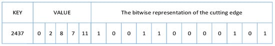 It represents the value converted from binary to decimal by each edge. If the tangent point is generated on an edge, the corresponding position of the edge is 1; otherwise, it is 0. In the above formula, is an array composed of edge numbers. Those arrays indicate the order of topological connection between edges, and n is the number of data. For example, assuming that the number of tangent points after cutting is 5, and the tangent points are located on the five edges numbered 0, 2, 7, 8, and 11, the value of this type of circumstance is shown in Figure 6. Because the hexahedron has 12 edges, it corresponds to 12 bits, the bottom right square represents the edge numbered 0, the left square represents the edge numbered 11, and the location of the occurrence of corresponding cutting edges is 1. Subsequently, a decimal value of 2437 is obtained, which is in accordance with the topology constituting the three triangles, i.e., 0-2-8, 2-8-7, 2-8-7.