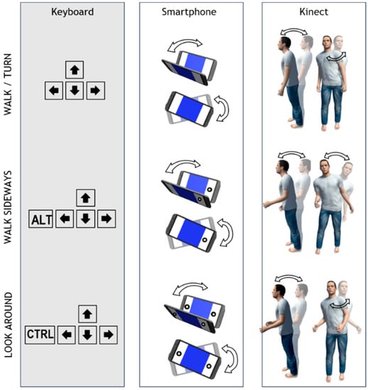 The interaction techniques for the three modalities (keyboard, Kinect, and smartphone) in each navigation mode (shown in Figure 1) are the following:
