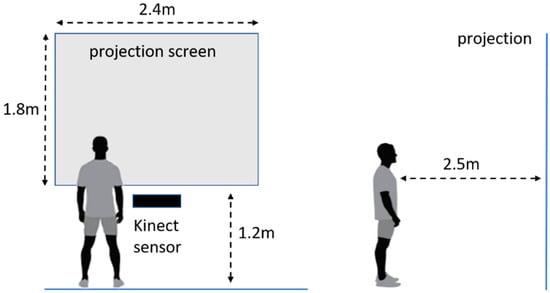 Both studies took place in the laboratory and shared the same settings and equipment. For the testbed environment, a PC with Intel Xeon CPU 3.70 GHz, 16 Gb Ram (Intel, Santa Clara, CA, USA), and an NVIDIA Quadro K4200 graphics card (NVIDIA, Santa Clara, CA, USA) was utilized, and a projection screen through an Epson EB-X24 Projector (Epson, Nagano, Japan) was used to display the scene. For all three modalities in the comparative study and the one used for elicitation, each user was standing at a distance of about 2.5 meters from the projection screen. In the keyboard-based input, users were seated using a wireless keyboard; in the Kinect-based input, users were standing in front of a Microsoft Kinect 2 (Xbox One) sensor (Microsoft, Redmond, WA, USA); and in the smartphone-based input, they were standing at the same spot holding a Xiaomi mi4i phone that was running the controller app. Figure 2 shows the setup of the user study in terms of screen dimensions, sensor placement, and user distance from screen.