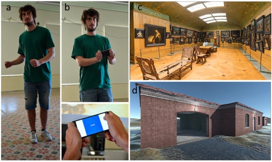 A user interacting with the 3D environment using Kinect (a) and a smartphone (b) and the two scenes used in the study: museum (c) and buildings (d).