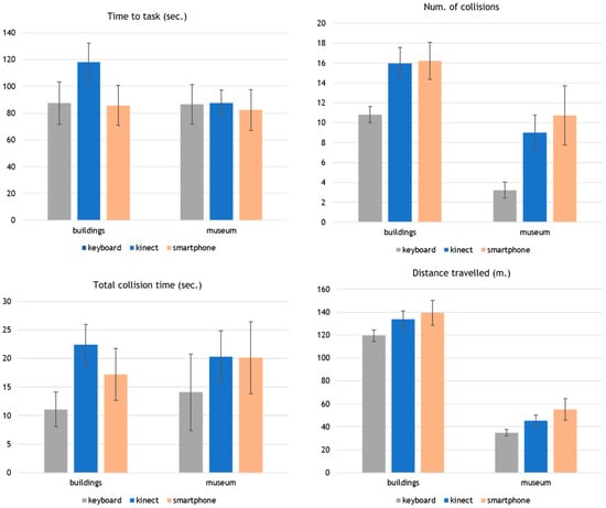 Mean values of the total time to finish the task in seconds (upper left), number of collisions (upper right), total collision time in seconds (lower left), and total distance travelled in meters (lower right) in the buildings and museum scenes. Error bars represent 95% confidence intervals.