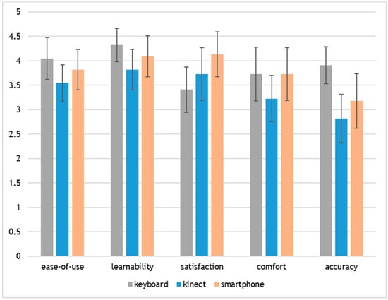 Mean values of subjective user ratings regarding ease-of-use, learnability, satisfaction, comfort, and accuracy. Error bars represent 95% confidence intervals.