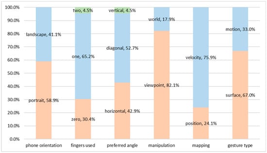 We categorized the proposed user gestures based on the aforementioned taxonomy. The results are displayed in Figure 6. Regarding the phone orientation, there seems to be a slight preference to portrait mode. In total, 58.9% of the gestures were performed in portrait mode, whilst the other 46.4% were in landscape. The most dominant case in the number of fingers was the use of a single finger, which appeared in 65.2% of the gestures compared to 30.4% using zero fingers and only 4.5% using two. As per the preferred angle, it is obvious from the results that the majority of users held the phone in a diagonal angle (52.7%), gestures performed with a horizontal phone setup were significantly fewer (42.9%), whilst only 4.5% of the gestures used a vertical angle. The dominant manipulation mode was viewpoint, which was the one performed in 82.1% of all gestures. However, there is a significant percentage of users who proposed gestures using a world metaphor; it was found in 17.9% of all gestures. Similarly, most gestures used velocity mapping (75.9%), but some users proposed actions with position mapping (found in 24.1% of all gestures). Finally, the type of gestures that the users performed was mostly surface gestures using single or multiple touches (67%). Motion gestures were significantly fewer (33%), and they were proposed mostly by inexperienced users.