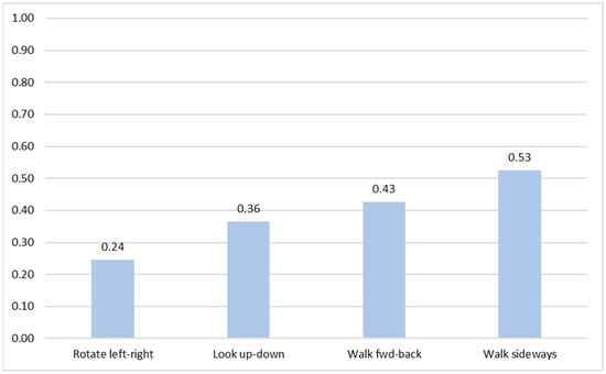 where i is the number of unique gestures, Pi is the number of users that agreed on the ith gesture, and P is the total number of users. The highest agreement score was reached in walk sideways (0.53), followed by walk fwd-back (0.43). On the contrary, the two remaining tasks associated with camera rotations, i.e., look up-down and rotate left-right, had lower agreement scores (0.36 and 0.24, respectively). The results are shown in Figure 7.