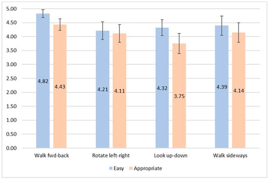Regarding the subjective user ratings of their proposed gestures, the scores were generally high. The mean values of the question ‘how easy it was to produce the gesture’ for the tasks, walk fwd-back, rotate left-right, look up-down, and walk sideways, were 4.82, 4.21, 4.32, and 4.39, respectively. We performed a Wilcoxon signed rank test between the easiness ratings of the four tasks and found that walk fwd-back was rated significantly higher compared to the other three tasks (p = 0.004 for rotate left-right, p = 0.004 for look up-down, and p = 0.042 for walk sideways). Regarding the appropriateness of the proposed gestures, people seemed to agree that their gestures were appropriate, but the mean score was noticeably lower for the look up-down gesture (3.75). The other three gestures had mean scores of 4.43 for walking fwd-back, 4.11 for rotating left-right, and 4.14 for walking sideways. A Wilcoxon signed rank test between the values of appropriateness of the four tasks revealed a statistically significant difference between look up-down and walk fwd-back (p = 0.006) and between look up-down and walk sideways (p = 0.029). Figure 8 displays the mean values of subjective user ratings for the four tasks with 95% confidence intervals.