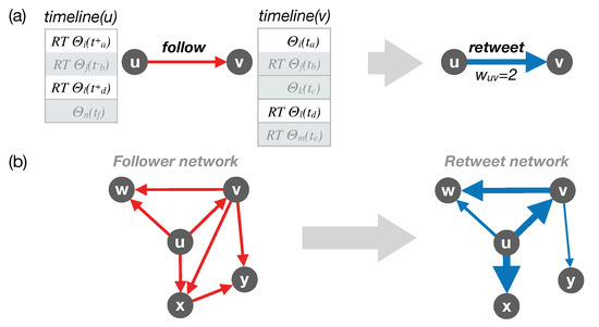 - the follower network at t by adding a directed link if u follows v at t, representing potential attention of u to v (as schematically shown in Figure 1a,b left panels). The out-degree of u in that network directly denotes the number of followees of u, while the in-degree denotes the number of followers of v.