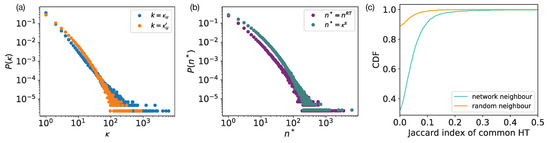 Figure 2. Distributions of degrees, activity, and similarity measures. (a) Distributions of the out- and in-degrees of nodes in the retweet network. (b) Distributions of the number of retweets () and number of hashtags () per user. (c) Cumulative distribution of the Jaccard similarity between hashtag sets of connected (blue) and randomly selected (orange) pairs of users of the retweet network.