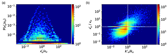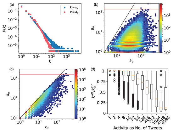 To this end, we turn to the measure of meaningful attention, through the analysis of the attentional degree measured in our Twitter data. As shown in Figure 4a, this quantity appears to be heterogeneously distributed, but it takes values over a limited range as compared to the corresponding out-degree distribution of the retweet network. Next, to see how concentrated attention is, we plot the density of vs. in Figure 4b. This tells us to what extent users focus on a certain number of users among their followees. Irrespective of the number of followees, we observe that the attentional degree remains concentrated around a relatively narrow core in the order of about ∼10 users. For any user, it does not go above a hard threshold of a hundred users, even for users who follow hundreds or thousands of accounts. The observation that the reduced number of meaningful neighbors appears with such an upper limit is in a striking accordance with earlier suggestions. Dunbar’s hypothesis suggests [1,2] that due to cognitive limitations, a person can maintain only about 150 meaningful social relationships at the time (shown as a red solid line in Figure 4b,c). Furthermore, other empirical studies, using different metrics than here, confirmed this suggestion in case of mobile phone communications [4] and in case of online social platforms, like Twitter [14], which would otherwise allow for more economic ways of interactions than traditional communication means.