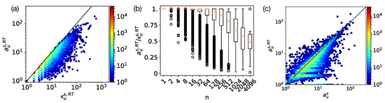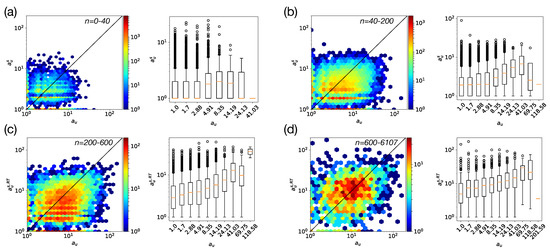 We plot the relationship between a and in Figure 6a–d, distinguishing various levels n of posting activity (i.e., again, in terms of total publications). For all levels, semantic attention appears to be correlated with social attention, with positive R Pearson correlation coefficients and p-values summarized in Table 1. On heatmaps, highest densities are found around the diagonal, while boxplots again confirm a generally positive association between both types of attention. Besides, as said before, there seems to be a non-linear relationship between posting activity and the average value of the social and semantic attentional degrees: centers of mass of degrees on all heatmaps do not move as quickly to the right as the center of mass for the respective retweet number ranges.