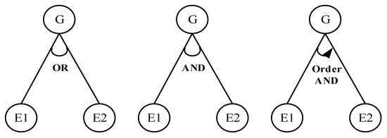 The AT was first proposed by Schneier [16]. In the structure of an AT, the root node represents the target of the attack [17]. The characteristics of system security are described on the basis of the AT. These descriptions redefine the data on attacks by identifying whether the DAS security or survival criteria are satisfied, and the data are regarded as the root nodes of the tree. In Figure 2, a node represents the means of implementing an attack, and the relationship among the nodes may be the logical OR, that is, the attack target can be reached when one of the two nodes E1 and E2 satisfies the attack conditions; AND, that is, the attack target can be reached when nodes E1 and E2 satisfy the attack conditions simultaneously; or Order AND, that is, when the attack target is reached after nodes E1 and E2 satisfy the attack conditions [18]. The AT has the advantages of simple structure, easy to understand presentation method, and easy to focus the analysis process on measurable targets. It can be combined with the obvious features of DAS in terms of architecture and simplify the DASs of system security features.