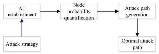 The DAS AT model must consider the environment and the DAS security architecture. Figure 3 shows the main stages of the DAS AT model. The nodes of all leaves will first be quantified when the ATs are established. Then, the probability of a successful attack in all paths of the system will be calculated by modeling the DAS AT. The attack path sequence is obtained through calculation, and the path with the maximum attack probability is the optimal attack path.