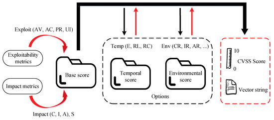 As shown in Figure 4, the CVSS consists of three basic score indicators, namely the base score, the temporal score, and the environmental score. The base score includes exploitability metrics and impact metrics, which have their own calculation formulas. The temporal and environmental scores can be expanded. Moreover, a vector string and a CVSS score, which represent the calculation process and the result, respectively, are generated.