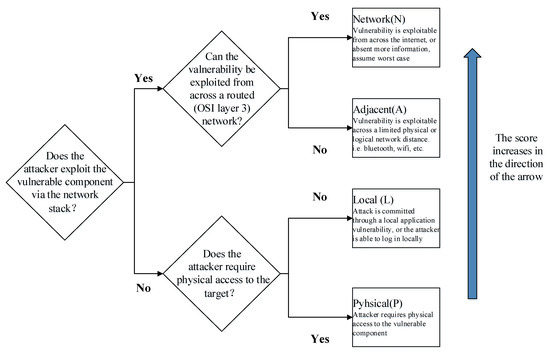 For example, the scoring rubric for Attack Vector (AV) is divided into four possible metric methods. Figure 5 shows the division of measurement methods [22]. The score increases in the direction of the arrow in the figure. For example, the metrics of Network (N) and Adjacent (A) are the vulnerable components via the network stack, and the metrics of Local (L) and Physical (P) require physical access to the target. Network (N) can be exploited from across a routed network, which makes it easier to implement network attacks, so the measurement value is higher. However, the metric of Adjacent (A) is only exploitable across a limited logical or physical network distance.