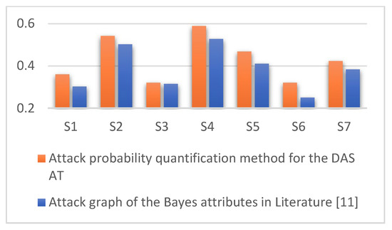 The Bayes method [11] was compared with the proposed attack probability quantification method to verify the latter’s accuracy. The Bayes method aims to quantitatively evaluate the vulnerability of computer networks using a Bayes attribute attack graph and the CVSS. Figure 7 shows the results of the comparison. The two methods for evaluating attack sequence probability exhibit different performance with respect to highlighting risky paths. Figure 7 shows that the proposed AT model obtains a higher attack probability than the Bayes method when evaluating paths S2 and S4. In an actual DAS architecture displayed in Figure 1, the attack probability on paths S2 and S4 is the highest, which represents E1 Distributed encryption, E3 Front-end device, and E5 Distributed terminal in DASs. The probability result of the attack sequences obtained by the two methods are slightly different, and both S2 and S4 are the attack paths with the highest risk probability, which also verifies the reliability and validity of the proposed method. On the other hand, the proposed AT model probability is higher than the Bayes method probability 4.02%—6.11% in conditions S2 and S4. From Figure 7, the proposed method probability of attack is higher than the Bayes method, and the experimental result is conducive to security practitioner to pay more attention to the protection of dangerous parts of DASs.