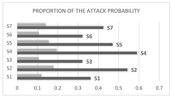 Figure 8 shows the proportions of all attack paths for the DAS. The DAS attack risks of each attack path in the system are emphasized, and the most dangerous part of the system is identified. Table 4 and Figure 8 show that the most profitable attack sequences for attackers are S2 and S4 in this experiment, and the corresponding attack methods are distributed denial-of-service attacks and website intrusions. Therefore, the DAS security practitioners should spend more time focusing on defending against these associated attacks and system vulnerabilities. For example, defense measures for the network traffic at the web end and the main station’s server could be applied.