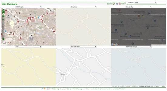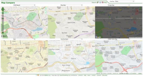The comparison of Figure 1 and Figure 2 shows Kibera on six main map services in two different scales [29]. Figure 1 shows an overview of Nairobi at scale 1:35,000 and most of the map providers show at least name Kibera, what is an enormous change since 2015, when only OpenStreetMap and Google Maps showed Kibera as a village or an area [30]. Zooming in to 1:4,000 (Figure 2) the area of the Kibera is shown only on OpenStreetMap and Google Maps, while the level of detail on OSM is much better than other maps. The difference is both in quantity of spatial information displayed as well as quality (detail).