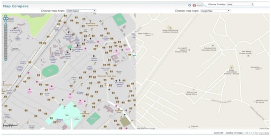 The most discussed topic in collaborative mapping is data accuracy within the context of map data quality and correctness. Based on the principle of the collaborative process, there is always a hint of subjectivity. The key question is how high the level of subjectivity is. The coverage and accuracy of OpenStreetMap is often connected with the amount of volunteers mapping in a given area. As stated in Haklay [17], there is evidence to suggest that there are “areas where nobody wants to map”, e.g., Kibera in Kenya and Villa Rica in Peru, which are mentioned in the case studies. However, those areas are not covered in commercial products. If collaborative mapping is available in those areas, it is based on individual volunteers. In that case, the mapping process is more or less affected by subjectivity, and data accuracy could not be 100% precise. Furthermore, compared to the blank areas in commercial maps, it is much better to have an imperfect map than a blank paper.