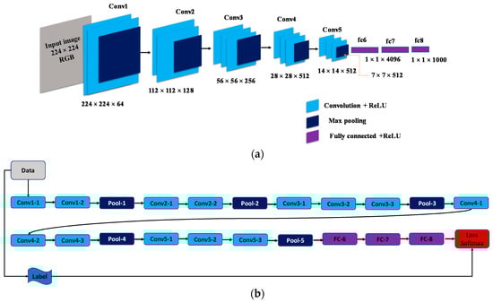 General Structure of the VGG-16 network: (a) Convolution layers of the VGG-16 network, and (b) data flow in the VGG-16 network [].