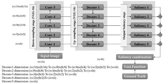 - A deep learning architecture based on the VGG-16 network that is able to predict visual saliency is proposed. As opposed to the current state-of-the-art technique that uses three stages in the encoder/decoder architecture [], the proposed network uses five encoder and decoder stages to produce a useful saliency map (e.g., visual saliency). This makes the proposed architecture more powerful for extracting more specific deep features;