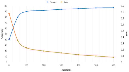 The proposed model was trained on a standard dataset (i.e., SALICON) []. This dataset consists of a training dataset (10,000 images) and validation dataset (5000 images), both with ground truth data and a test dataset (5000 images) without ground truth data. All the images are in JPG format, except for the ground truth dataset, which is in grayscale PNG format, and all images have a resolution of 640 × 480. At the beginning of the training, all the weights of the filters were initialized based on the pre-trained network (VGG-16), which has an input image of 224 × 224 and a Gaussian distribution with a 0.01 standard deviation and zero mean for the weights of each layer []. The purpose of using the VGG-16 pre-trained network is to transfer the learned knowledge and reuse it to predict human visual saliency. Additionally, the network parameters were as follows: Initial Learn Rate: 0.01; Max Epochs: 10; Mini Batch Size: 10; and number of iterations: 620. The network was trained on 10,000 images and used selected images from the test datasets for testing (the global accuracy of the proposed model was 96.22%). Moreover, using the loss function (SGDM), the model parameters learned to increase the speed of convergence and to decrease output errors. Figure 3 illustrates the training progress produced by the proposed model from the specified training images (SALICON).