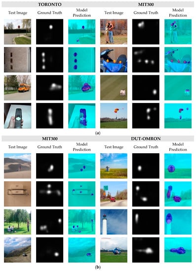 Model testing: (a) TORONTO and MIT300 datasets, and (b) MIT1003 and DUT-OMRON datasets.