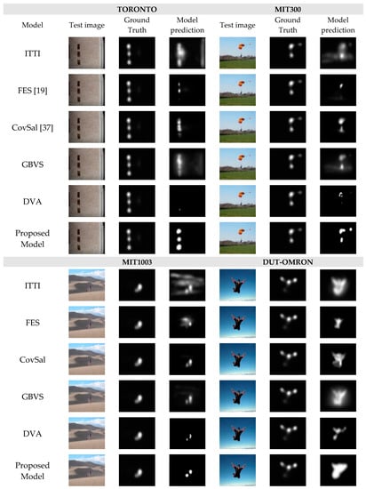 Table 1 shows that, with the TORONTO dataset, the proposed model outperforms the other six models in terms of the NSS, AUC-Judd, and AUC-Borji metrics; however, in terms of the SIM (similarity) metric, the DVA algorithm [] has the best results. This is because the SIM metric is better suited for non-binary classifiers. However, the proposed algorithm is a binary classifier. The other metrics used in the study (NSS, AUC-Judd, and AUC-Borji) are all binary classifier metrics.