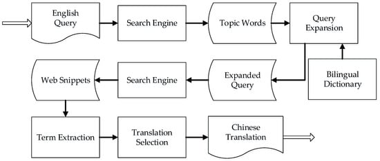 Taking the mining of English–Chinese translations as an example, the system works in the following steps: Firstly, the system sends source queries in English to a search engine for the retrieval of English documents. Secondly, related topic terms—serving as hint words for topic or subject of the queries—are mined from English snippets returned in the first step. Thirdly, the source queries, along with translations of subject terms obtained from the English–Chinese bilingual dictionary, are put into the search engine again to attain related snippets from the bilingual web. The “expanded query” usually consists of “the source query plus translated topic words”. In the next step, valid terms are extracted from bilingual snippets returned, followed by the last step for sorting the ranks of candidate terms for obtaining final translations. In brief, three main parts are included in the system: