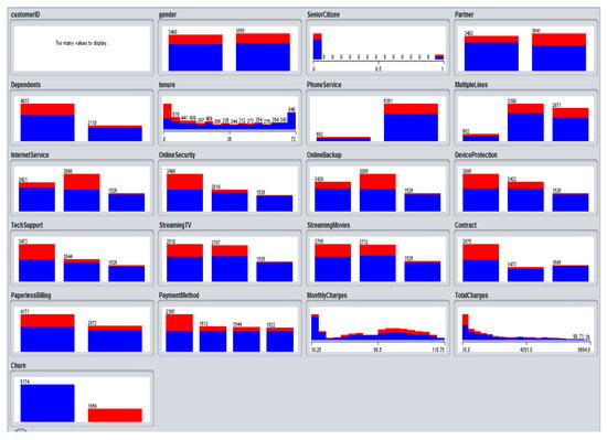 The distribution of attributes in churn dataset; Here red indicates churn customers while blue indicates non-churn customers. The figure is derived from Weka software [72].