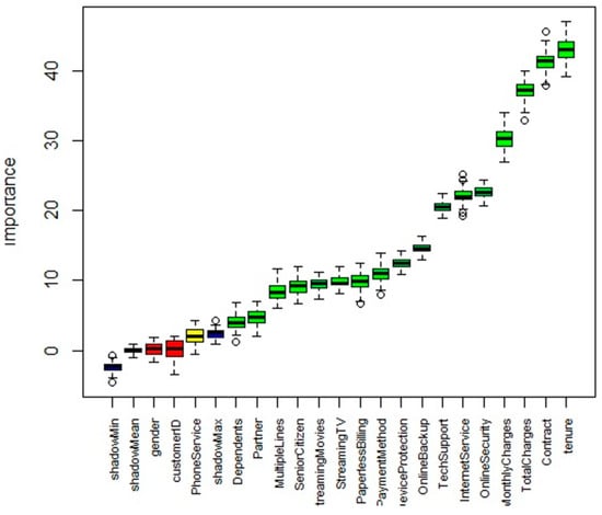 The soundness of features derived from dragonfly algorithm is further validated using a wrapper-based random forest classifier, Boruta algorithm available in R programming language. The algorithm shuffles independent attributes in the dataset to ensure correlated instances are separated. It is followed by building a random forest model for merged data consisting of original attributes. Comparisons are further done to ensure that variables having higher importance score are selected as significant attributes from data [69]. Boruta algorithm is selected because of its ability in choosing uncorrelated pertinent data features. Henceforth this confirmatory approach ensures relevant churn attributes are selected prior to privacy analysis.
