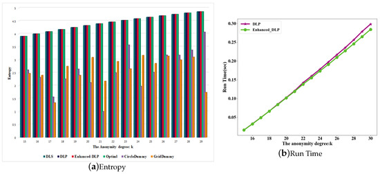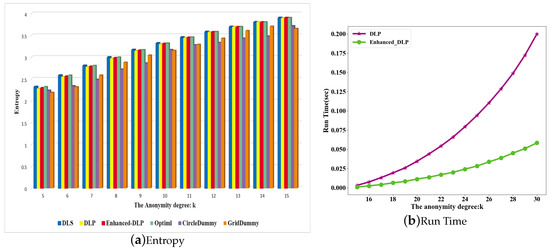 Figure 4a,b illustrate the results of the comparison of entropy and run time in Scenario 2. In Figure 4a, the entropy obtained by all schemes increases continuously when the value of k increases. While the entropy of the Enhanced-DLP and the DLP scheme are the same, there are big differences in the computational costs in Figure 4b. With an increase in k, the run time of the DLP scheme increases rapidly but the Enhanced-DLP run time varies little. And the run time of the Enhanced-DLP is 68.14% lower than that of the DLP. The reason is that the DLP scheme adopts the greedy scheme to select dummy locations, which needs to calculate all the residual locations in candidate set to ensure the current set has the largest entropy. While the Enhanced-DLP scheme adopts the enhanced greedy manner, which only needs to calculate and to successively select dummy locations to ensure the largest entropy. Furthermore, the computational complexity of the DLP scheme (i.e., O()) is higher than the Enhanced-DLP scheme (i.e., O(n)), where n and k are the same. The experimental results are also consistent with the results of our analysis. The run time of Enhanced-DLP is much lower than that of DLP.