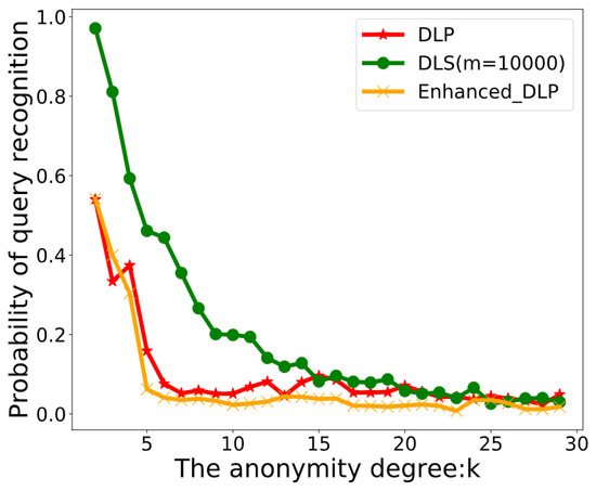 Figure 5 illustrates the probability of query recognition under an ADLS attack for three different scheme. As the value of k increases, the probability of query recognition of three schemes is gradually reduced, which indicates that it is more difficult to get the user’s real location from the anonymous set. The DLS scheme has the highest probability of query recognition under the same attack. The reason is that once the history query probabilities of two locations are different in the DLS scheme, their chosen optimal dummy location sets must be different. In this property, an adversary can easily identify the user’s real location from an anonymous set. We can also see that the probability of query recognition of the Enhanced-DLP and the DLP scheme is the lowest. Although the query recognition probability of the DLP scheme decreases with the increase of k, the probability of query recognition is still higher than that of the Enhanced-DLP scheme. Moreover, the probability of query recognition of the Enhanced-DLP is 33.63% lower than that of the DLP scheme. The probability of query recognition of the Enhanced-DLP scheme does not vary much with the increase of anonymity degree k. This is because the Enhanced-DLP scheme adopts an enhanced greedy scheme to successfully select dummy locations which ensures the entropy of the current anonymous set is the largest, while the DLP scheme adopts the greedy scheme to select dummy locations using the enumeration scheme from the candidate set. This is vulnerable to privacy breaches from ADLS attacks and requires more time to generate anonymous sets.
