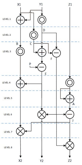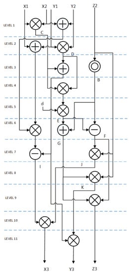 We did minor modifications in the Elliptic Curve Point Doubling (ECPD) formulae (9) and Elliptic Curve Point Addition (ECPA) (10) to minimize the number of holding registers and optimize hardware implementation. Data flow diagram of ECPD and ECPA are shown in Figure 1 and Figure 2, respectively. At each level one modular multiplication is performed. Modular addition and/or modular subtraction is performed in parallel with modular multiplication whenever possible.
