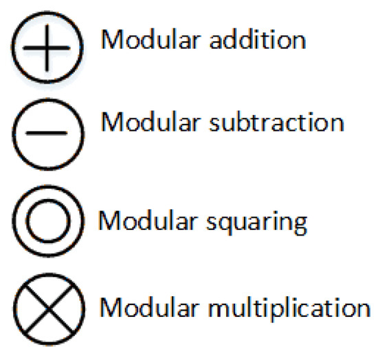 - Bunimov, V.; Schimmler, M. Area and Time Efficient Modular Multiplication of Large Integers. In Proceedings of the IEEE International Conference on Application-Specific Systems, Architectures, and Processors (ASAP 2003), The Hague, The Netherlands, 24–26 June 2003. [Google Scholar]