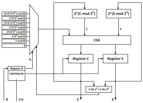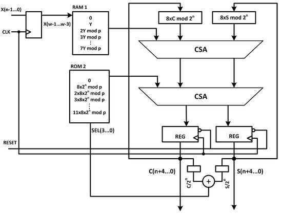 Instead of comparing with the modulus, they compared intermediate values with and precomputed and saved the difference in a look-up table. This precomputed difference is added to the intermediate value at the next iteration. Figure 5 shows their proposed hardware architecture. To reduce the number of cycles the High-Radix technique has been proposed [18,19,20,21].
