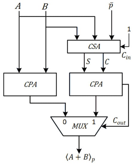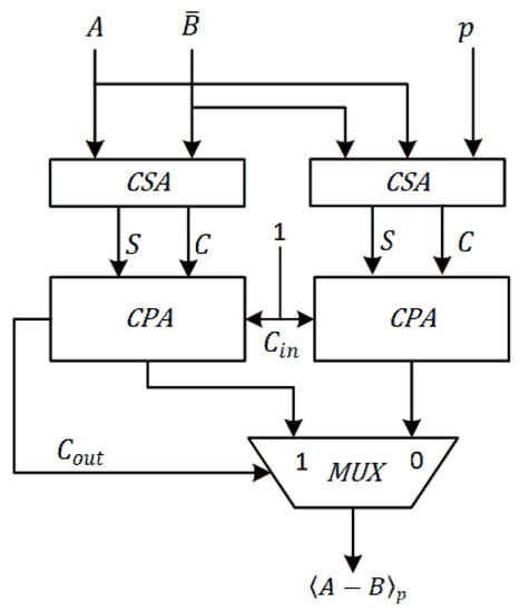 Figure 7 and Figure 8 show the proposed fast and area-efficient modular addition and subtraction units, respectively. The Carry Propagate Adders (CPA) and a Carry Save Adder(CSA) resources are shared and the implementation is fast and very area-efficient. ( and denotes bitwise not and not respectively.)