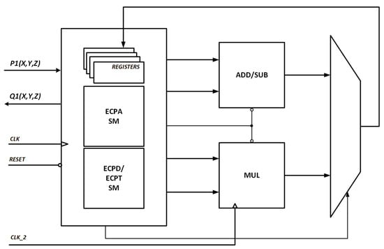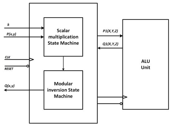 Point multiplication unit uses an Arithmetic Logic Unit (ALU) that consists of a point addition and a point doubling state machine. As shown in Figure 9, the state machines share the modular multiplication and modular add/subtract arithmetic units as well as register bank resources.
