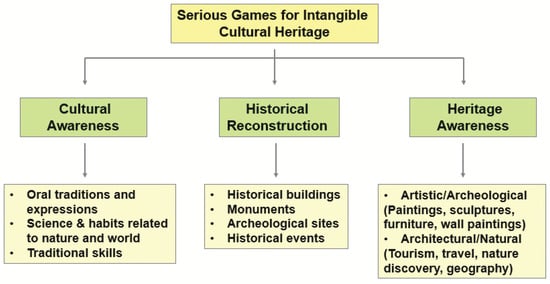 Authors in [17] recognize the importance of serious games usage for preservation of intangible cultural heritage. They differentiate three categories as shown in Figure 1, namely, cultural awareness, historical reconstruction and heritage awareness and they assess available serious games in those domains as well as their educational objectives. In addition to knowledge behind traditional skills, cultural awareness category encompasses oral traditions and expressions as well as habits related to nature and world in general. Various ancient cultures are explored through serious games [17] and allowed users to observe their influence on the contemporary cultures or simply be aware of the historical events, processes, or even entire periods in human history. In addition, users could explore contemporary cultures prior to travelling by means of serious games whether that be related to architectural or natural environment. Depending on a design of serious game it could provide future traveller virtual exposure to chosen culture enriched with plethora of cultural tasks such as language, music, dance, religious ceremonies, customs, and similar. Considering constant advancement in the technology both entertainment and serious games are becoming more powerful and appealing to consumers, with one major difference being that serious game industry has emerged as vision to use technology and activities contained in entertainment games and apply it to non-entertainment fields.
