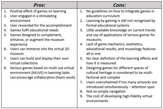 The main contribution of the paper is the identification of the advantages and disadvantages of game-based learning in museums. These have been discussed and analyzed in more detail through the available examples. The main outcomes are presented in Figure 2. It should be noted that, in addition to the above, we identified game logistics as a disadvantage and content differentiation as an advantage, however, due to the lack of specific examples and evaluations, we could not include them in this research because no concrete conclusions or assumptions could be made.
