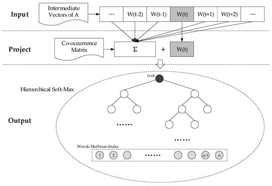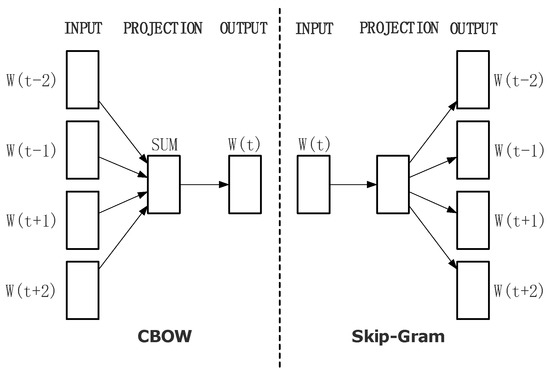 Word2vec contains two word embedding models, as shown in Figure 1. The continuous bag-of-words model (CBOW) aims to predict the current word from contextual words, while Skip-gram predicts the contextual words from current word. In order to improve training efficiency, there are two different accelerate algorithms, namely hierarchical soft-max and negative samples (NEG). Essentially, hierarchical soft-max algorithm is a continuous classification problem based on Huffman theory. It optimizes the traditional soft-max algorithm and avoids the all-words probability calculation for each iteration. The training efficiency is greatly improved, and the time complexity is reduced from to . NEG is a simplified algorithm of noise contrastive estimation (NCE) [27]. It constructs the training set by weighted negative sampling and balances the distribution of words by subsampling. In general, compared with hierarchical soft-max, NEG is faster because it avoids the circular classification along the inner node path.