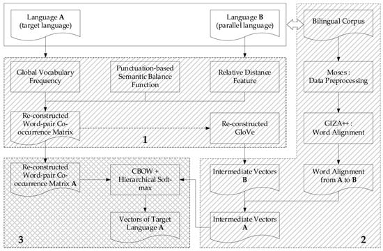In this section, we present a word embedding model based on semantic obstructing punctuation (SOP) and parallel corpus, which integrates with the punctuation-based semantic balance function, relative distance feature, bilingual alignment information, word-pair co-occurrence matrix, and reconstructed Word2vec model together. Figure 2 shows the training process of this model.