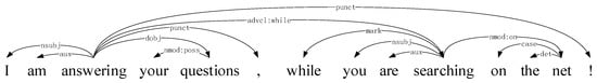 The distance attenuation function is used to determine the relative position feature weight of a word pair in the context window. This weight reflects the semantic relevance between word pairs. Intuitively, the further the distance between words in a sentence, the lower the semantic relationship between them. At present, there are two representative distance attenuation functions, such as in Word2vec and in GloVe, where L is the context window size and is the absolute distance between and . However, due to the grammatical structure and punctuation marks used in the sentences, the simple distance attenuation function does not match the actual semantic relationship satisfactorily. Figure 3 shows the dependency analysis of a sentence, in which the directed arc connection path between the two words indicates the semantic correlation of this word pair. As we can see, the semantic relation of {answering, questions} is closer than {your, questions}, while the former has a longer word spacing than the latter. Meanwhile, {I, questions} is also closer than {questions, while} because of the semantic interrupt caused by punctuation “,”. Both of them show that the simple distance attenuation function used in GloVe or Word2vec does not work well in actual contexts. A direct and effective strategy is to replace the absolute distance with the span in the dependency tree between word pairs. Unfortunately, this approach requires corresponding dependency treebanks or dependency analysis tools, which is time-consuming and labor-intensive for low-resource languages.